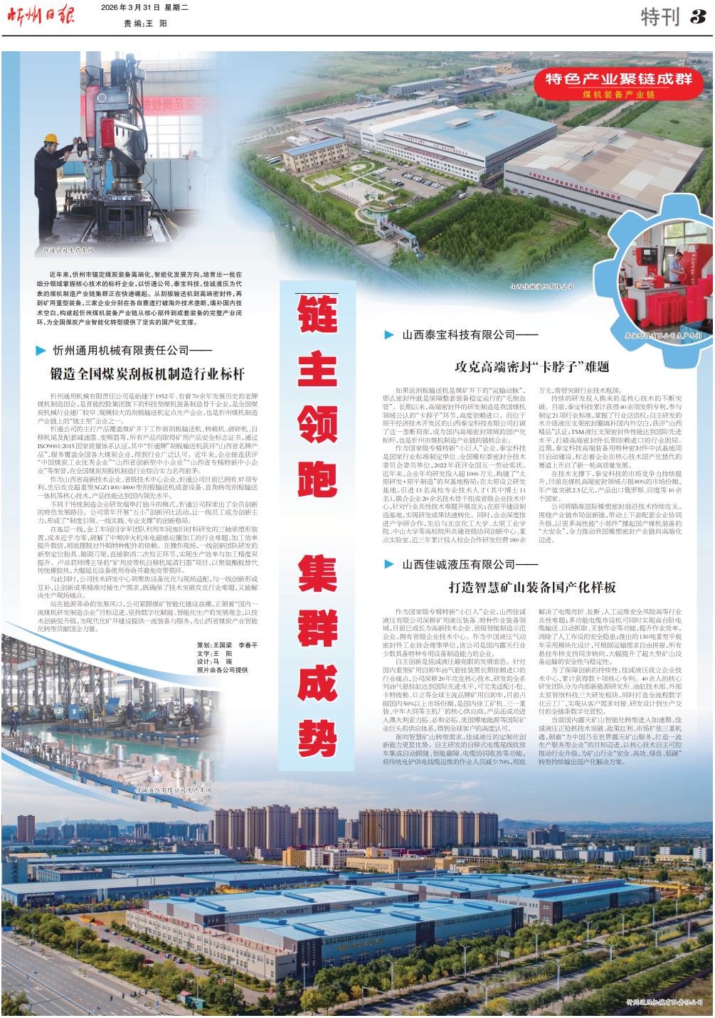 近年來,忻州市錨定煤炭裝備高端化、智能化發(fā)展方向,培育出一批在細(xì)分領(lǐng)域掌握核心技術(shù)的標(biāo)桿企業(yè),以忻通公司、泰寶科技、佳誠液壓為代表的煤機(jī)制造產(chǎn)業(yè)鏈集群正在快速崛起。從刮板輸送機(jī)到高端密封件,再到礦用重型裝備,三家企業(yè)分別在各自賽道打破海外技術(shù)壟斷、填補國內(nèi)技術(shù)空白,構(gòu)建起忻州煤機(jī)裝備產(chǎn)業(yè)鏈從核心部件到成套裝備的完整產(chǎn)業(yè)閉環(huán),為全國煤炭產(chǎn)業(yè)智能化轉(zhuǎn)型提供了堅實的國產(chǎn)化支撐。 忻州通用機(jī)械有限責(zé)任公司—— 鍛造全國煤炭刮板機(jī)制造行業(yè)標(biāo)桿 忻州通用機(jī)械有限責(zé)任公司是始建于1952年、有著70余年發(fā)展歷史的老牌煤機(jī)制造國企,是晉能控股集團(tuán)旗下的科技型煤機(jī)裝備制造骨干企業(yè),是全國煤炭機(jī)械行業(yè)建廠較早、規(guī)模較大的刮板輸送機(jī)定點生產(chǎn)企業(yè),也是忻州煤機(jī)制造產(chǎn)業(yè)鏈上的“鏈主型”企業(yè)之一。 忻通公司的主打產(chǎn)品覆蓋煤礦井下工作面刮板輸送機(jī)、轉(zhuǎn)載機(jī)、破碎機(jī)、自移機(jī)尾及配套減速器、變頻器等,所有產(chǎn)品均取得礦用產(chǎn)品安全標(biāo)志證書,通過ISO9001:2015國家質(zhì)量體系認(rèn)證,其中“忻通牌”刮板輸送機(jī)獲評“山西省名牌產(chǎn)品”,服務(wù)覆蓋全國各大煤炭企業(yè),得到行業(yè)廣泛認(rèn)可。近年來,企業(yè)接連獲評“中國煤炭工業(yè)優(yōu)秀企業(yè)”“山西省創(chuàng)新型中小企業(yè)”“山西省專精特新中小企業(yè)”等榮譽,在全國煤炭刮板機(jī)制造行業(yè)綜合實力名列前茅。 作為山西省高新技術(shù)企業(yè)、省級技術(shù)中心企業(yè),忻通公司目前已擁有37項專利,先后攻克超重型SGZ1400/4800型刮板輸送機(jī)成套設(shè)備、直角轉(zhuǎn)彎刮板輸送一體機(jī)等核心技術(shù),產(chǎn)品性能達(dá)到國內(nèi)領(lǐng)先水平。 不同于傳統(tǒng)制造企業(yè)研發(fā)端單打獨斗的模式,忻通公司探索出了全員創(chuàng)新的特色發(fā)展路徑。公司常年開展“五小”創(chuàng)新評比活動,讓一線員工成為創(chuàng)新主力,形成了“制度引領(lǐng)、一線實踐、專業(yè)支撐”的創(chuàng)新格局。 在基層一線,金工車間閆學(xué)軍團(tuán)隊利用車間廢舊材料研發(fā)的三軸承塑形裝置,成本近乎為零,破解了中頻淬火機(jī)床電磁感應(yīng)圈加工的行業(yè)難題,加工效率提升數(shù)倍,徹底擺脫對外購特種配件的依賴。在操作現(xiàn)場,一線創(chuàng)新團(tuán)隊研發(fā)的新型定位胎具、微調(diào)刀架,直接取消二次校正環(huán)節(jié),實現(xiàn)生產(chǎn)效率與加工精度雙提升。盧彥君師傅主導(dǎo)的“礦用皮帶機(jī)自移機(jī)尾清掃器”項目,以聚氨酯板替代傳統(tǒng)橡膠塊,大幅延長設(shè)備使用壽命并避免皮帶損壞。 與此同時,公司技術(shù)研發(fā)中心則聚焦設(shè)備優(yōu)化與現(xiàn)場適配,與一線創(chuàng)新形成互補,讓創(chuàng)新成果精準(zhǔn)對接生產(chǎn)需求,既確保了技術(shù)突破攻克行業(yè)難題,又能解決生產(chǎn)現(xiàn)場痛點。 站在能源革命的發(fā)展風(fēng)口,公司緊跟煤礦智能化建設(shè)浪潮,正朝著“國內(nèi)一流煤機(jī)研發(fā)制造企業(yè)”目標(biāo)邁進(jìn),堅持?jǐn)?shù)字化賦能、智能化生產(chǎn)的發(fā)展理念,以技術(shù)創(chuàng)新促升級,為現(xiàn)代化礦井建設(shè)提供一流裝備與服務(wù),為山西省煤炭產(chǎn)業(yè)智能化轉(zhuǎn)型貢獻(xiàn)國企力量。 山西泰寶科技有限公司—— 攻克高端密封“卡脖子”難題 如果說刮板輸送機(jī)是煤礦井下的“運輸動脈”,那么密封件就是保障整套裝備穩(wěn)定運行的“毛細(xì)血管”。長期以來,高端密封件的研發(fā)制造是我國煤機(jī)領(lǐng)域公認(rèn)的“卡脖子”環(huán)節(jié),高度依賴進(jìn)口。而位于原平經(jīng)濟(jì)技術(shù)開發(fā)區(qū)的山西泰寶科技有限公司打破了這一壟斷局面,成為國內(nèi)高端密封領(lǐng)域的國產(chǎn)化標(biāo)桿,也是忻州市煤機(jī)制造產(chǎn)業(yè)鏈的鏈核企業(yè)。 作為國家級專精特新“小巨人”企業(yè),泰寶科技是國家行業(yè)標(biāo)準(zhǔn)制定單位、全國橡標(biāo)委密封分技術(shù)委員會委員單位,2022年獲評全國五一勞動獎狀。近年來,企業(yè)年均研發(fā)投入超1000萬元,構(gòu)建了“太原研發(fā)+原平制造”的雙基地格局:在太原設(shè)立研發(fā)基地,引進(jìn)13名高校專業(yè)技術(shù)人才(其中博士11名),聯(lián)合企業(yè)20余名技術(shù)骨干組成省級企業(yè)技術(shù)中心,針對行業(yè)共性技術(shù)難題開展攻關(guān);在原平建設(shè)制造基地,實現(xiàn)研發(fā)成果快速轉(zhuǎn)化。同時,企業(yè)深度推進(jìn)產(chǎn)學(xué)研合作,先后與北京化工大學(xué)、太原工業(yè)學(xué)院、中山大學(xué)等高校院所共建省級協(xié)同創(chuàng)新中心、重點實驗室,近三年累計投入校企合作研發(fā)經(jīng)費180余萬元,借智突破行業(yè)技術(shù)瓶頸。 持續(xù)的研發(fā)投入換來的是核心技術(shù)的不斷突破。目前,泰寶科技累計獲得40余項發(fā)明專利,參與制定21