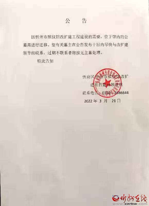 因忻州市殯儀館改擴建工程建設(shè)的需要,位于館內(nèi)的公墓需進行遷移(不涉及骨灰寄存)。望有關(guān)墓主在公告發(fā)布十日內(nèi)盡快與改擴建領(lǐng)導(dǎo)組聯(lián)系。過期不聯(lián)系者將按無主墓處理。