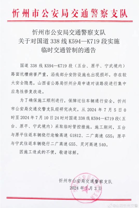 關于對國道338線K594—K719段實施臨時交通管制的通告