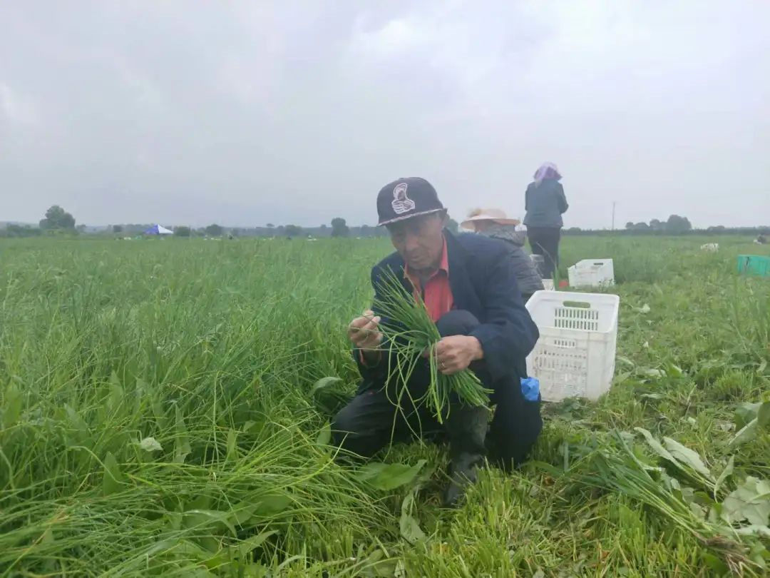 在右玉縣威遠(yuǎn)鎮(zhèn)小香蔥種植基地,連片種植的小香蔥長勢(shì)喜人。三五成群的農(nóng)民穿著雨鞋,蹲在地里用小鐮刀割蔥,割下一把后把雜草撿出來,把黃尖掐掉,干凈整齊地?cái)[進(jìn)筐子里。
