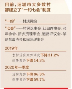 目前,運城市大多數(shù)村都建立了“一約七會”制度——“一約”是村規(guī)民約,“七會”是村民議事會、紅白理事會、老年協(xié)會、新鄉(xiāng)賢理事會、道德評議會、禁賭禁毒協(xié)會和民調(diào)理事會。這“一約七會”制度的不斷健全,對破除鄉(xiāng)村社會陋習、引導群眾移風易俗、引領社會新風、化解矛盾糾紛,維護基層社會和諧穩(wěn)定起到了重要作用。村民的正能量多了,鄉(xiāng)村的負面事情少了,社會治安狀況得到明顯改善,群眾安全感顯著增強。2019年運城市農(nóng)村治安案件同比下降31.2%,刑事案件下降14.3%;2020年一季度,治安案件下降86.3%,刑事案件下降59.7%。