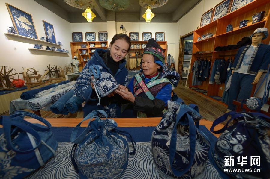 12月1日,在丹寨縣金泉街道千年傳蠟染制作坊,店員和易地扶貧搬遷村民在欣賞蠟染畫(huà)手工藝成品。新華社記者 楊楹 攝