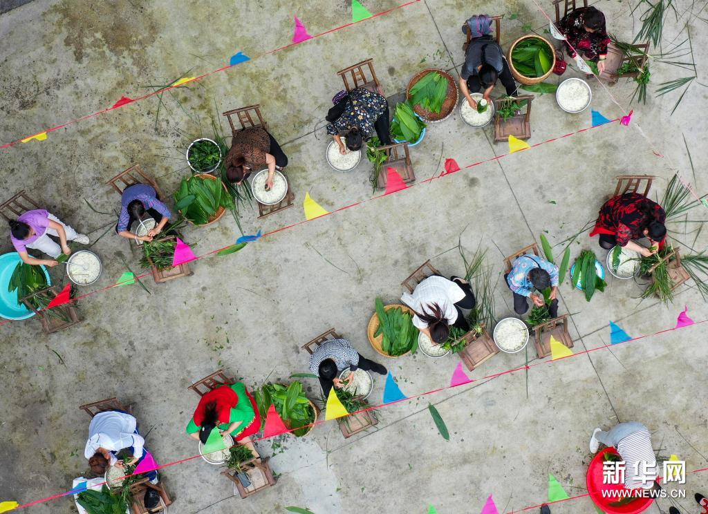 6月2日,貴州省銅仁市玉屏侗族自治縣亞魚鄉(xiāng)郭家灣村村民參加包粽子比賽(無人機(jī)照片)。端午節(jié)將至,貴州省銅仁市玉屏侗族自治縣亞魚鄉(xiāng)郭家灣村舉行“我們的節(jié)日,端午”群眾文化活動(dòng),村民們聚在一起比賽包粽子,喜迎端午節(jié)。新華社發(fā)(胡攀學(xué)攝)
