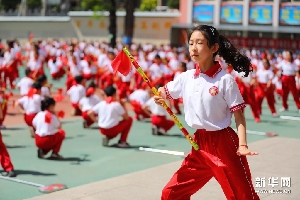 6月10日,在承德市雙橋區(qū)南營(yíng)子小學(xué),學(xué)生在大課間上練習(xí)“霸王鞭”。近年來,河北省承德市雙橋區(qū)南營(yíng)子小學(xué)以開展“陽光大課間”為平臺(tái),將非遺民間舞蹈“霸王鞭”融入學(xué)校素質(zhì)教育實(shí)踐中,通過聘任專業(yè)老師,開設(shè)“霸王鞭”體育運(yùn)動(dòng)社團(tuán),引導(dǎo)小學(xué)生在大課間上練習(xí)“霸王鞭”,增強(qiáng)體質(zhì),傳承非遺。新華社發(fā)(劉環(huán)宇 攝)