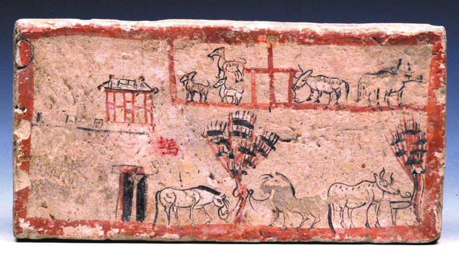 塢壁是東漢時期極具特色的建筑,由于當(dāng)時地方豪強(qiáng)勢力急速發(fā)展,廣泛兼并土地,蔭庇宗族與賓客,形成自己的武裝與生產(chǎn)力量,逐漸出現(xiàn)了塢、屯、壁、堡、壘、營、寨等集生產(chǎn)、生活、軍事為一體的建筑,閉門成市,后來在魏晉時期發(fā)揚(yáng)光大。嘉峪關(guān)長城博物館藏的一塊畫像磚,磚面左側(cè)繪一小城,城墻上筑雉堞,城門上建譙樓,榜題“塢”字,塢外繪有兩株樹,還有一群牛馬羊在悠閑吃草,形象再現(xiàn)了塢的建筑形制。