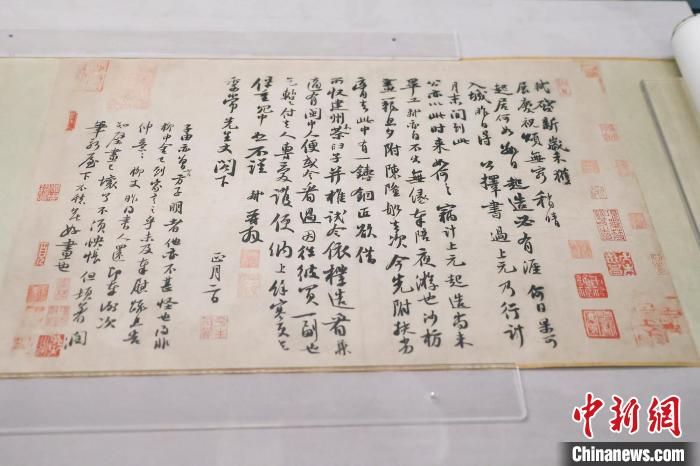 近日,“千古風(fēng)流 不老東坡——蘇軾主題文物展”在海南省博物館舉行。圖為展出的蘇軾真跡《人來(lái)得書(shū)帖》。 中新社記者 駱云飛 攝