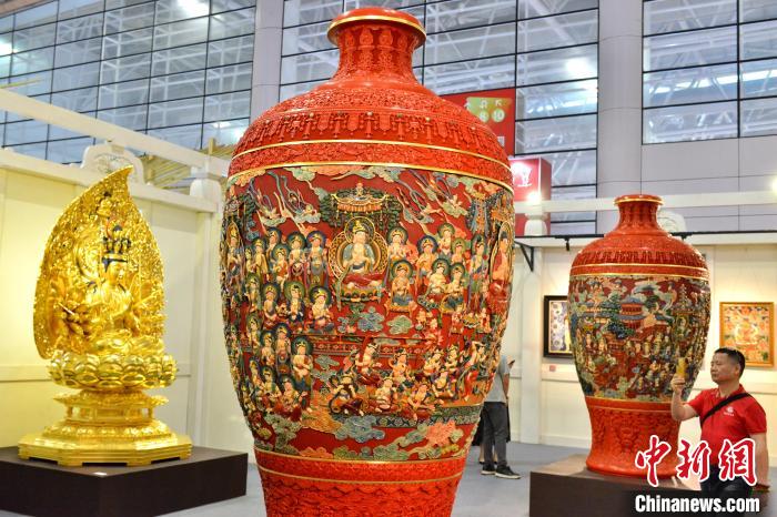 5月9日,第四屆中國工藝美術博覽會在福建福州啟幕,圖為雕漆作品《凈土文化對瓶》吸引觀展者目光。 中新網記者 呂明 攝