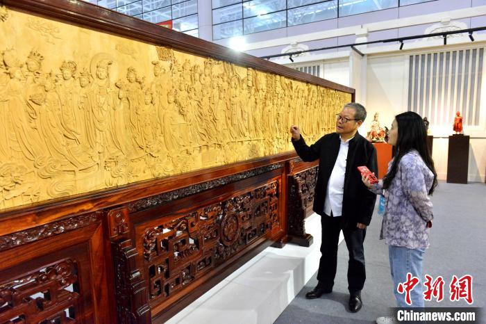 中新網福州5月10日電 (葉秋云)9日至12日,第四屆中國工藝美術博覽會于福建福州舉辦,由中國工藝美術學會造像藝術專委會主任、中國工藝美術大師袁師永與徒弟共同創(chuàng)作的雕漆作品《凈土文化對瓶》首次面向觀眾展出,吸引眾多觀展者的目光。