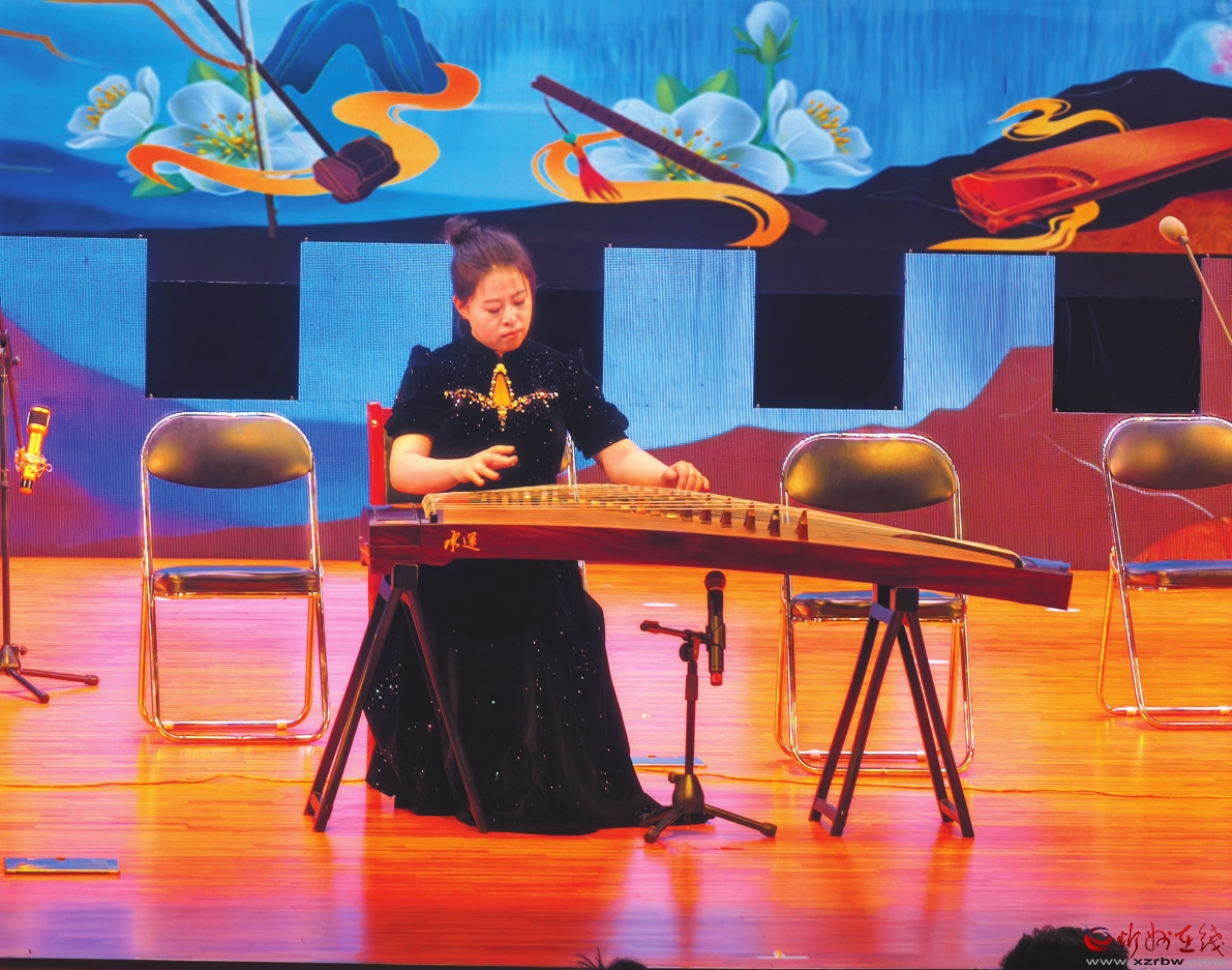 由忻府區(qū)文化和旅游局選送、忻州佳音民族樂團演奏的古箏獨奏《云裳訴》,是周煜國先生于2002年創(chuàng)作的一首著名古箏協(xié)奏曲,曲名取自李白詩句“云想衣裳花想容”。全曲以白居易長詩《長恨歌》為素材,描繪了唐玄宗與楊貴妃的愛情故事,音樂具有濃郁的陜西風味。演奏者王佳曾先后師從于中央音樂學院博士生導師、古箏名家周望教授和山西職業(yè)藝術學院史玲玲教授,具有深厚的理論功底和扎實的專業(yè)技巧。演奏中,一方面她充分運用左手按顫音、滑音等技巧,特別在演奏微升“fa”和微降“si”音時,左手快速準確地按壓弦以獲得準確的音高,并配合顫音凸顯出哀怨的情緒;另一方面通過快速的指序和搖指技巧,形象地描述了馬嵬坡前唐玄宗與楊貴妃訣別的痛苦情狀。