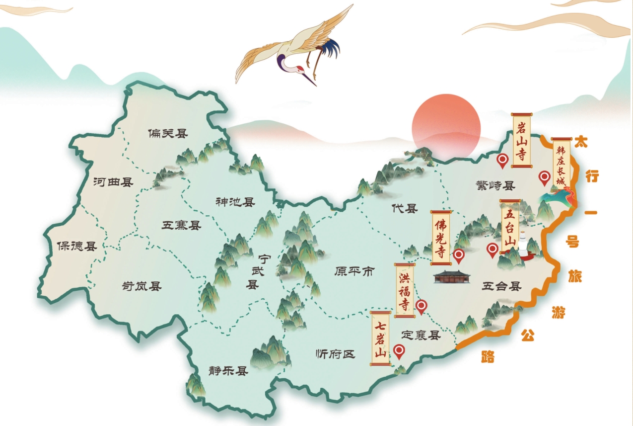 太行一號(hào)旅游公路是山西省農(nóng)村道路的重要組成部分,同時(shí)也是打造黃河、長(zhǎng)城、太行三大旅游板塊,推進(jìn)鄉(xiāng)村振興的戰(zhàn)略性基礎(chǔ)性工程。沿途貫穿忻州、太原、陽泉、晉中、長(zhǎng)治、晉城6市45個(gè)縣(市、區(qū)),聯(lián)通全省122個(gè)A級(jí)以上景區(qū)、239個(gè)非A級(jí)旅游資源(點(diǎn)),主線已成功入選全國(guó)20條“行在鄉(xiāng)村,游在路上”的最美自駕精品路線。旅游公路忻州段起點(diǎn)位于五臺(tái)縣韓家樓村,途經(jīng)五臺(tái)山風(fēng)景區(qū),終點(diǎn)與繁峙縣平型關(guān)長(zhǎng)城一號(hào)旅游公路主線相接,全長(zhǎng)185公里。