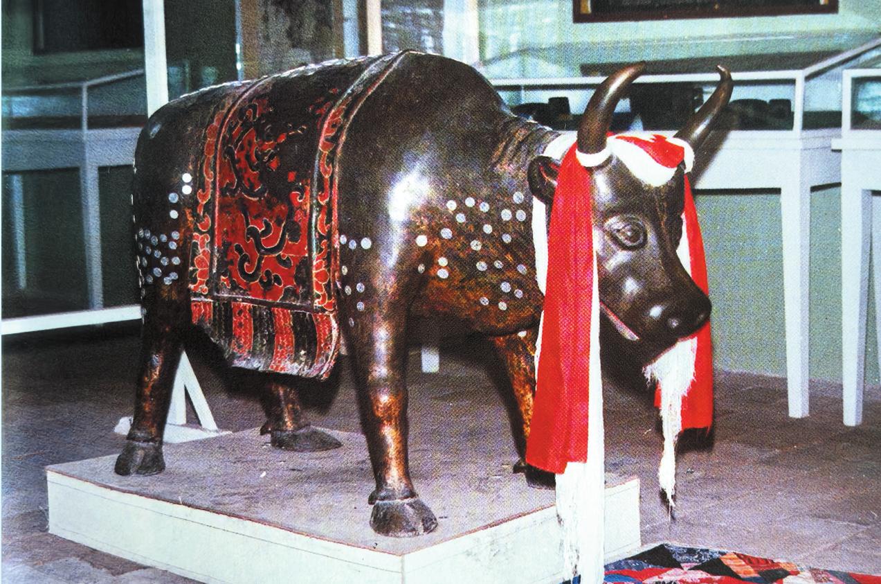 五臺(tái)山保存著一尊工藝精細(xì)、形態(tài)逼真、傳神入化的明代銅牛。這尊堪稱鑄造藝術(shù)品中佳品的銅牛,收藏在顯通寺藏珍樓內(nèi),通高85厘米,長(zhǎng)146厘米。它體魄雄偉,頭向前伸,分足而立,兩角內(nèi)收,閉嘴蓄力,圓目正視,奮力前行。銅牛四足協(xié)調(diào),造型逼真。銅牛的腰部有披墊,披墊上面繪有各種彩色花紋。銅牛原來(lái)還拉著一輛精致的銅車(chē)。車(chē)棚、輪、軸及車(chē)上的繩索均為銅質(zhì)。文物部門(mén)鑒定其為國(guó)家一級(jí)文物。