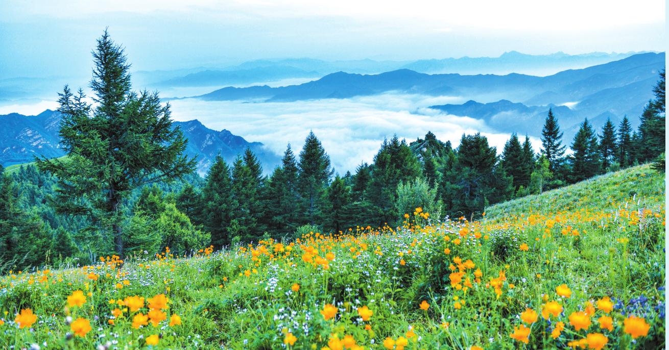 駝梁地形四周封閉,中為谷地,形成了山巒綿亙、溝壑縱橫、河川橫跨東西的自然生態(tài)景觀。其主峰海拔2281米,為“晉冀兩省四縣”交匯處,駝峰山巒蜿蜒,此起彼伏,猶如“靜臥巨駝”而取名駝梁。與五臺(tái)山風(fēng)景名勝區(qū)東北相望,遙相呼應(yīng),有其獨(dú)特和不可替代之優(yōu)勢(shì),同為五臺(tái)山旅游資源亮點(diǎn)。由山谷到山頂分布著落葉林混交林帶、樺樹(shù)林帶、落葉松林帶,生物垂直分布變化明顯。駝梁頂部,有一片亞高山草甸,約近萬(wàn)畝的茵茵綠草,像碩大無(wú)比的地毯,與天際交接,一望無(wú)垠。隱于藍(lán)天白云和松林綠波之間,散落著漫山遍野的杜鵑花、金蓮花、百合花、燈籠花等,置身其間,如進(jìn)花海,恍若仙境。因位于云霧縹緲的高山之巔,故被人譽(yù)為“云頂花?!薄?/p>