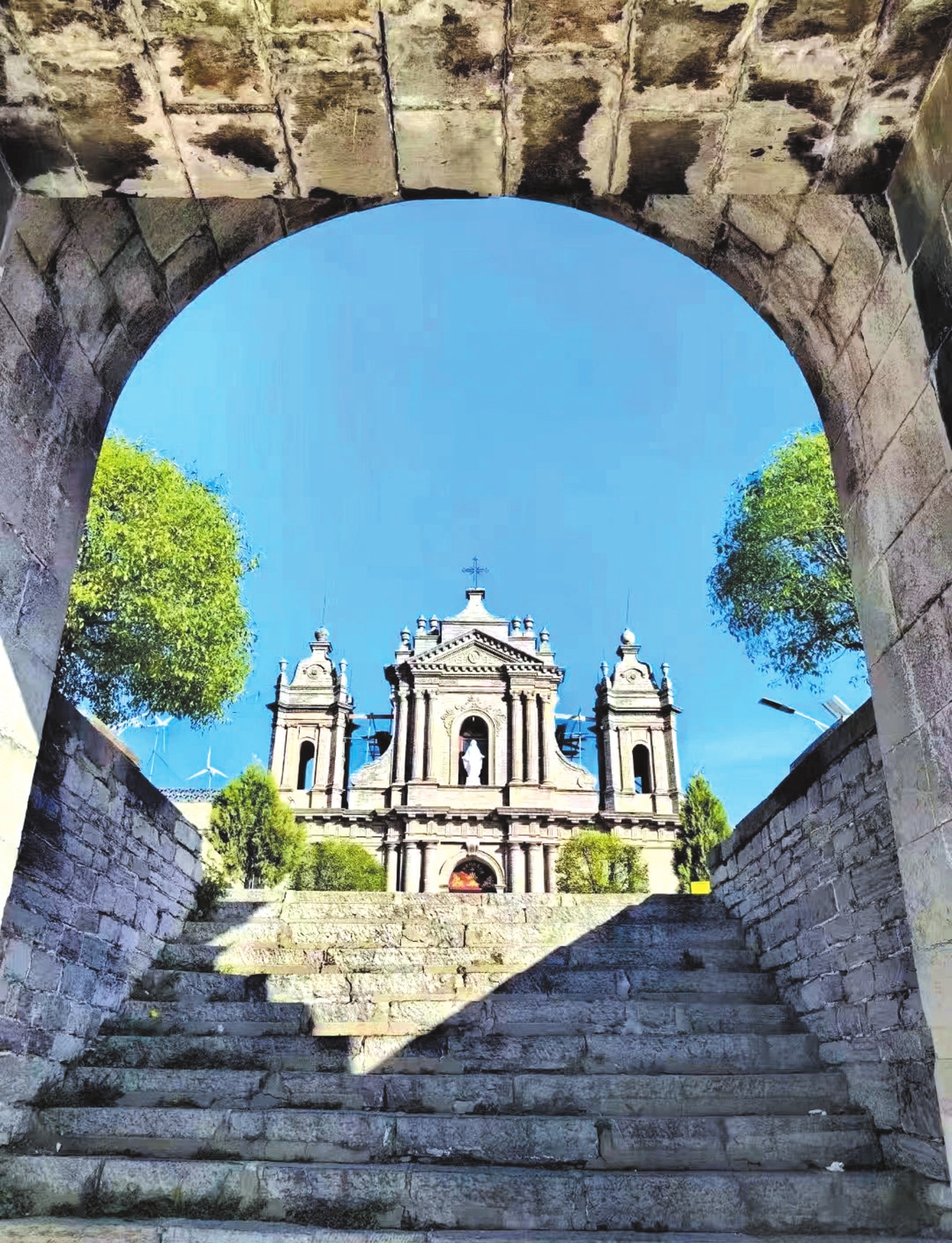 這座教堂始建于18世紀70年代,占地達三萬平方米。1897年—1898年間,意大利籍主教艾士杰與建筑師李有剛運用當地普通磚石,奇跡般建造出一座異國風情的高山城堡。教堂主體建筑簡練垂直,頂部裝飾方圓相間,數不清的十字架直指云天。內部則完全是西式的雕像、壁畫和教務活動,讓人恍如置身歐洲。