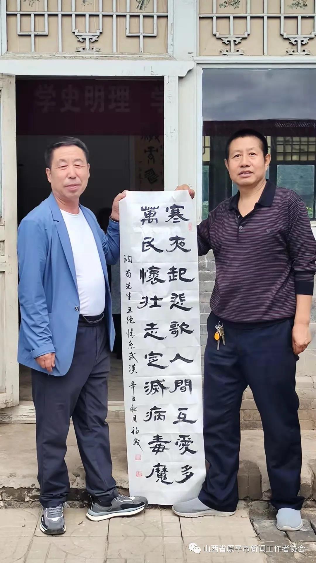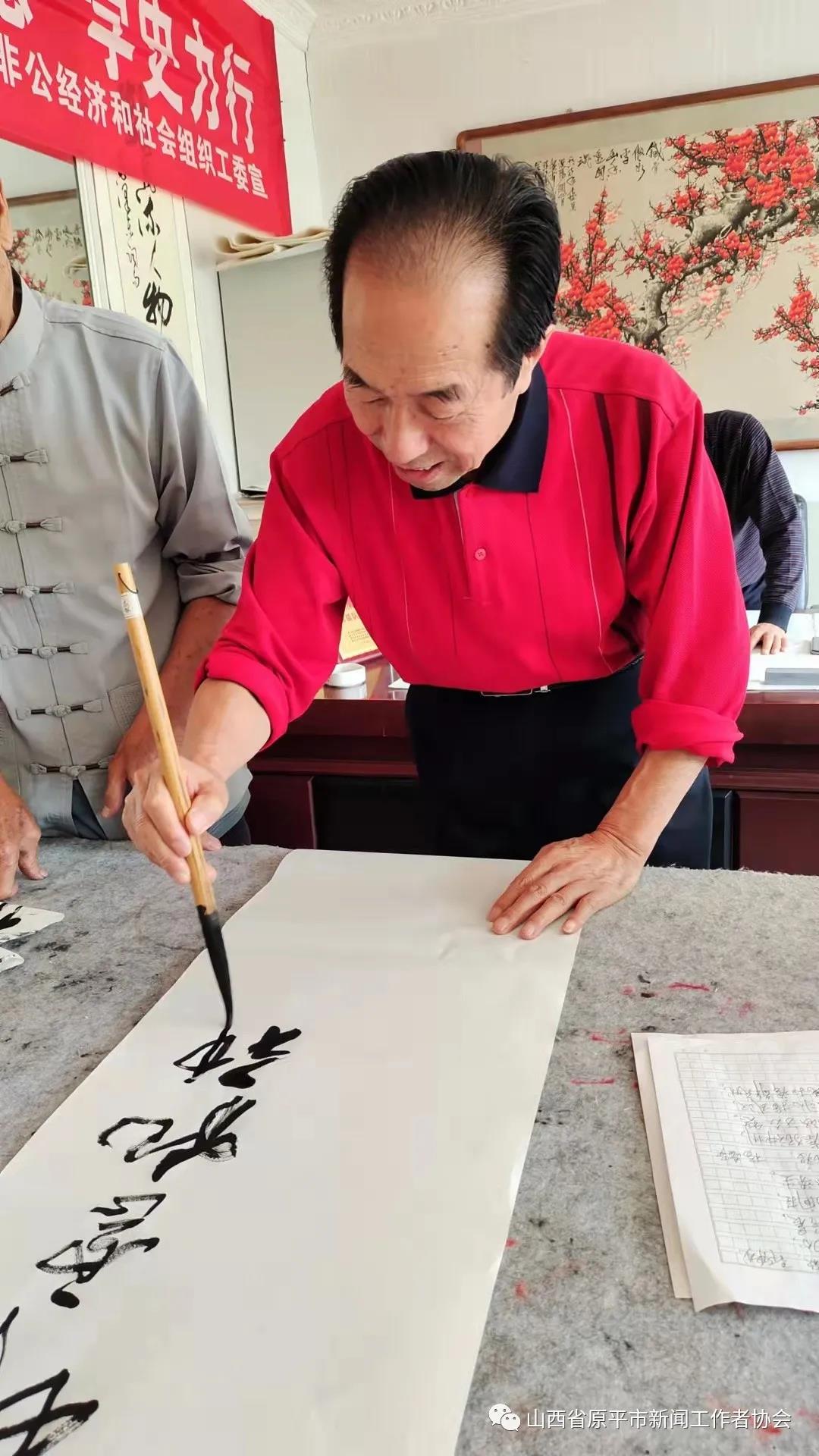 活動現(xiàn)場,大家暢所欲言,紛紛聯(lián)系思想實際,交流了學(xué)習(xí)黨史、明理知進(jìn)的心得體會,圍繞學(xué)史長知、學(xué)史明理、學(xué)史增信、學(xué)史興業(yè)進(jìn)行了熱烈討論。接著,書畫藝術(shù)組的書法家亢銀中、趙存仁、王玉伍、張正山、王福歲、王弘新,及學(xué)會顧問書畫名家溫樹森老師、以及特邀書畫名家李晉復(fù)先生,紛紛揮毫潑墨,書寫出學(xué)習(xí)黨史的感悟與名言。大筆揮灑中,一幅幅寫有“賡續(xù)精神血脈、傳承紅色基因”“明理增信.崇德力行”“不忘初心、牢記使命”和“江山就是人民、人民就是江山”等字樣的真、草、隸、篆、行書藝作品,從筆下飄然而出。墨香中呈現(xiàn)出各有千秋、韻味感人的風(fēng)格,博得觀賞者們的點贊稱道,并爭相拿到一幅贈品。書法家們顧不上喝水,整整忙了一個上午。特別是書畫藝術(shù)組組長李文光,由于平時在廣州忙于接送孩子上學(xué),放暑假回原平后特地趕來,高興地跟大家一起切磋書藝、展示才藝。書法家們還探討了書法藝術(shù)融入社會、融入黨性、服務(wù)大眾、服務(wù)中心的蹊徑、舉措與打算。(賈宣生 王福歲)