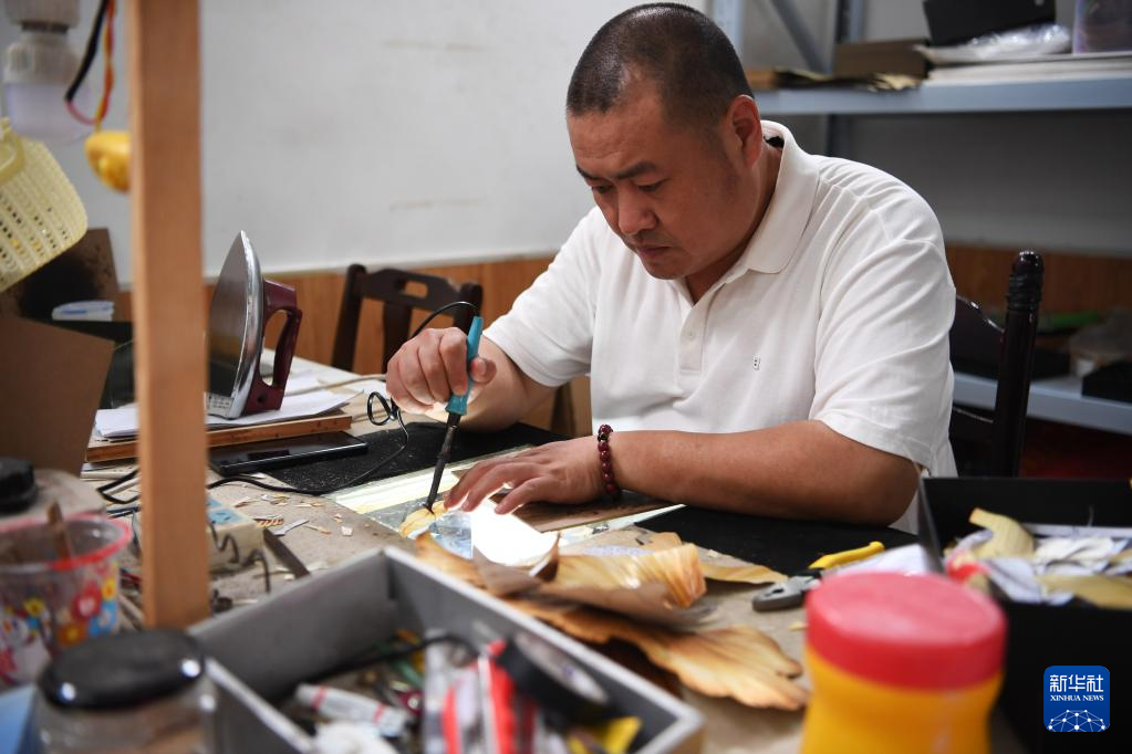 5月16日,葛磊在非遺傳習基地制作蘆葦畫。