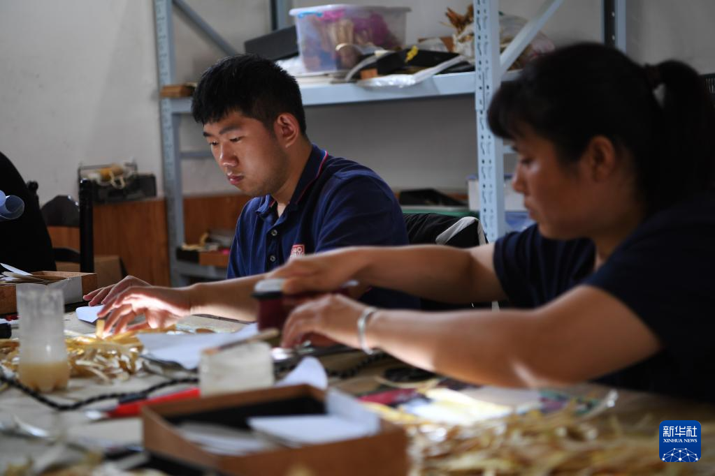 5月17日,張富揚(左)在非遺傳習基地制作蘆葦畫。