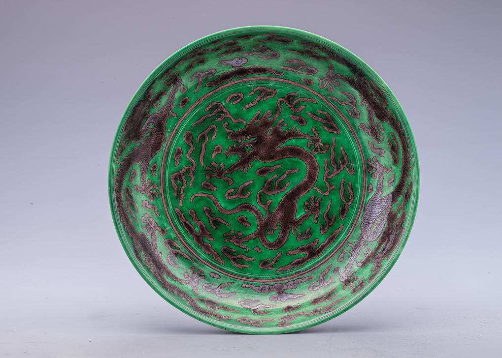展出的清康熙紫綠彩龍紋盤(pán)。