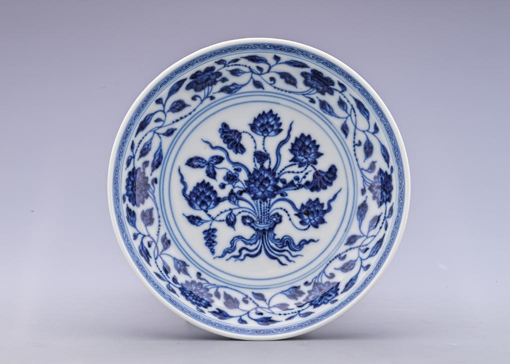 展出的清雍正青花折枝蓮紋盤(pán)。