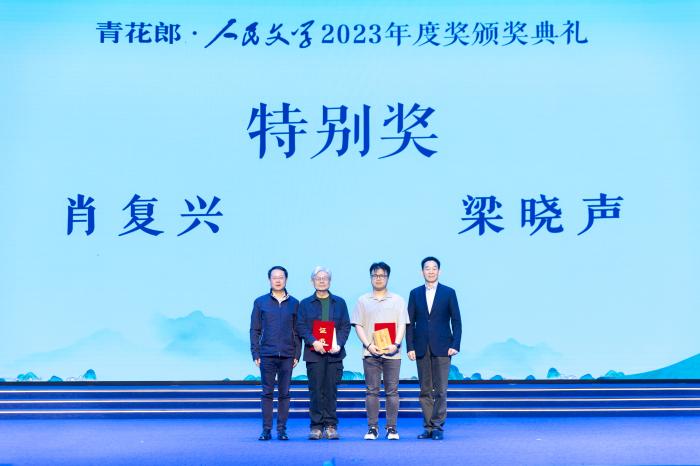 著名作家肖復(fù)興、梁曉聲獲得本屆“人民文學(xué)獎(jiǎng)”特別獎(jiǎng),梁曉聲小說責(zé)任編輯梁豪代為領(lǐng)獎(jiǎng)。圖片來源:主辦方供圖