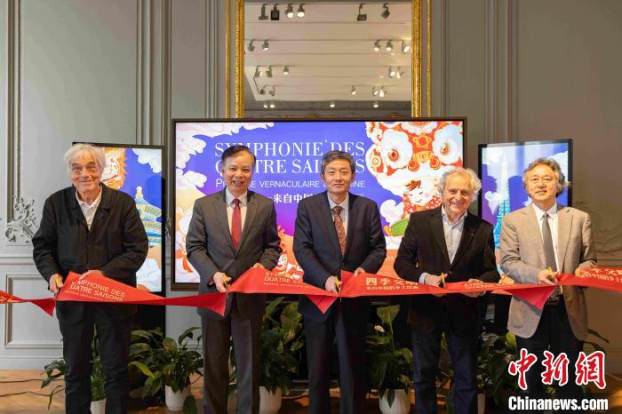 “四季交響——來自中國的鄉(xiāng)土繪畫”展覽于當(dāng)?shù)貢r(shí)間5月30日在巴黎中國文化中心拉開帷幕。圖為嘉賓們?yōu)檎褂[開幕剪彩。巴黎中國文化中心 供圖