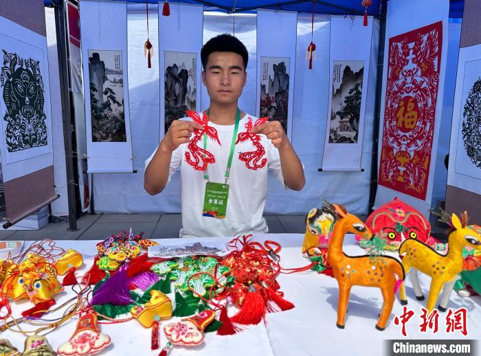 7月14日,甘肅省慶城職業(yè)中等專業(yè)學校學生張巖展示其剪紙作品。中新社記者 丁思 攝
