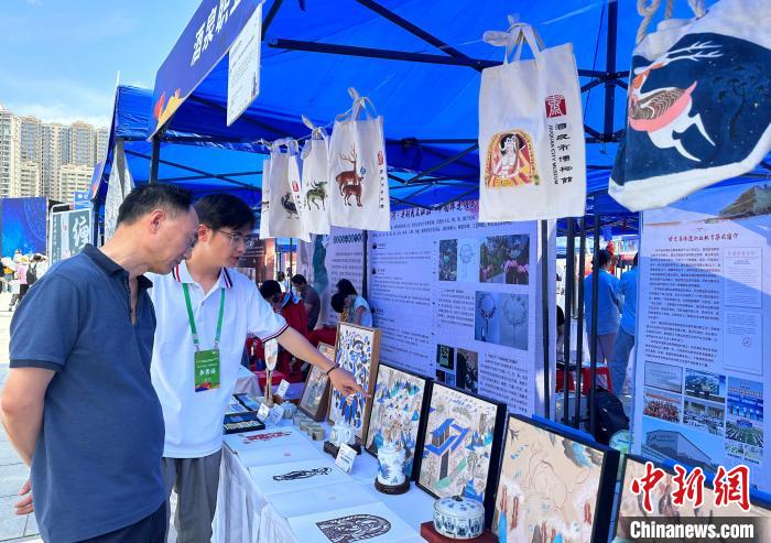 7月14日,酒泉職業(yè)技術(shù)學院學生王皓向觀眾介紹敦煌文創(chuàng)作品。中新社記者 丁思 攝