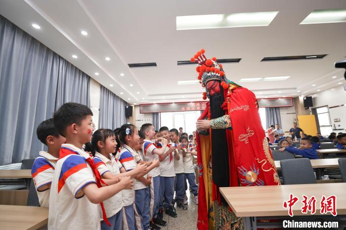 2023年6月26日,山西太原,小學生們與戲曲人物關(guān)公互動。當日,山西省武凌云晉劇名家工作室的藝術(shù)家們走進太原新建路小學校,將傳統(tǒng)戲曲引進課堂,讓學生們感受戲曲的魅力。 中新社記者 張云 攝