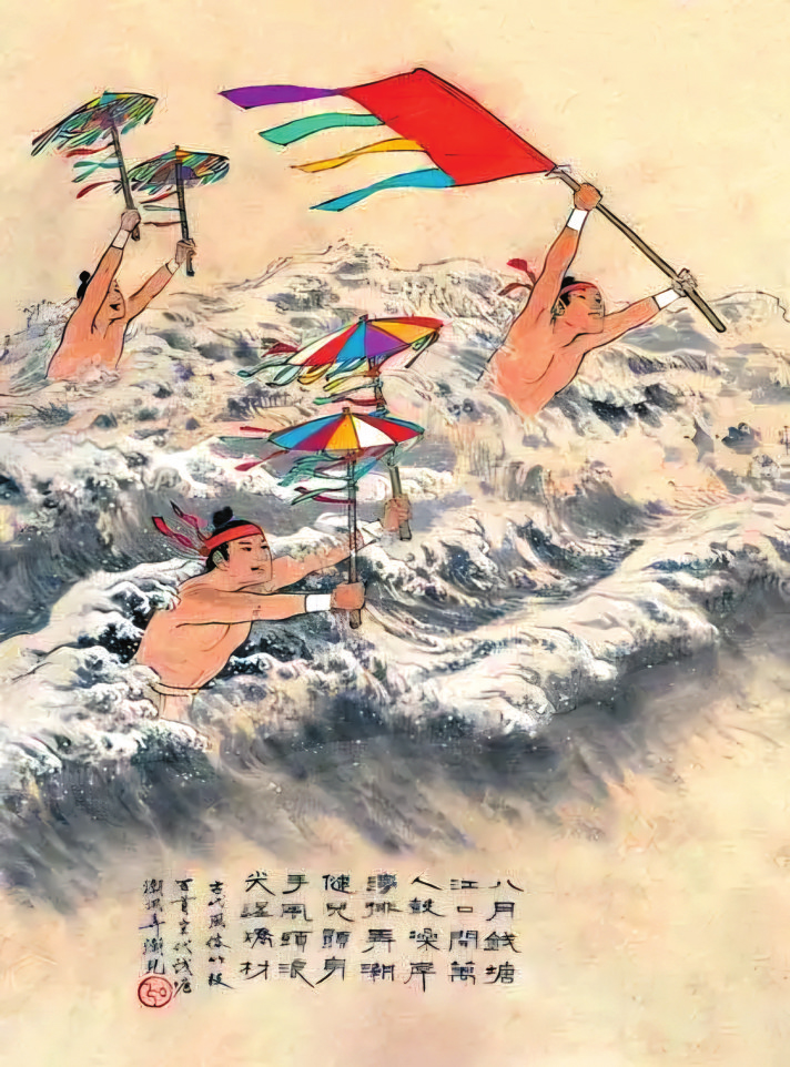 能在大江大河中搏擊風(fēng)浪的游泳好手,被人們尊稱為“弄潮兒”。唐人李益曾作閨怨詩《江南曲》:“嫁得瞿塘賈,朝朝誤妾期。早知潮有信,嫁與弄潮兒?!蹦纤五X塘江弄潮是一大盛事,“浙江之潮,天下之偉觀也”。在“大聲如雷霆,震撼激射,吞天沃日,勢極雄豪”的潮水中,數(shù)百名弄潮兒“皆披發(fā)文身,手持十幅大彩旗,爭先鼓勇,溯迎而上,出沒于鯨波萬仞中,騰身百變,而旗尾略不沾濕,以此夸能”。辛棄疾夸他們“不怕蛟龍怒。風(fēng)波平步??醇t旆驚飛,跳魚直上,蹙踏浪花舞”,潘閬更是贊嘆“弄潮兒向濤頭立,手把紅旗旗不濕”。