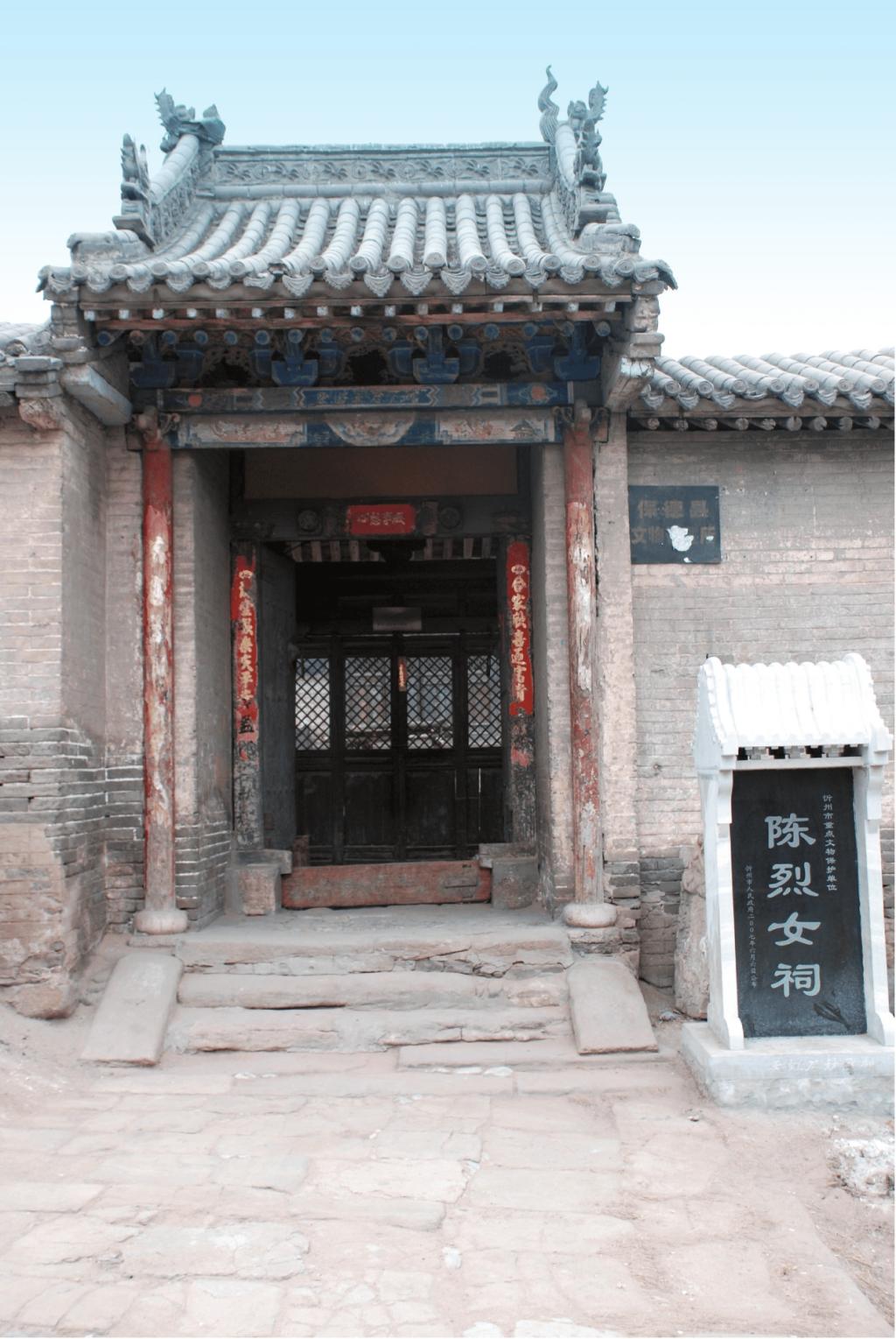 陳烈女祠坐西向東,為二進(jìn)院落布局。占地面積685平方米。大門一座,前院過(guò)殿面寬三間,單檐硬山頂;南北配殿各面寬三間,單檐硬山頂。后院正殿面寬三間,單檐硬山頂,前設(shè)小抱廈;后院正殿內(nèi)供奉陳烈女塑像。祠內(nèi)存有明崇禎七年(1634)“圣旨(復(fù)制品)”一道,新繪壁畫16平方米。2007年6月,陳烈女祠被忻州市人民政府公布為市級(jí)文物保護(hù)單位。