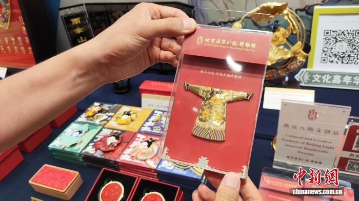 北京燕京八絕博物館依照館藏文物“京繡龍袍”設(shè)計(jì)的冰箱貼。(《中國(guó)新聞》報(bào) 任德輝 攝)