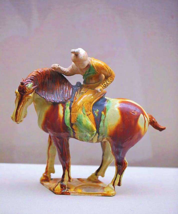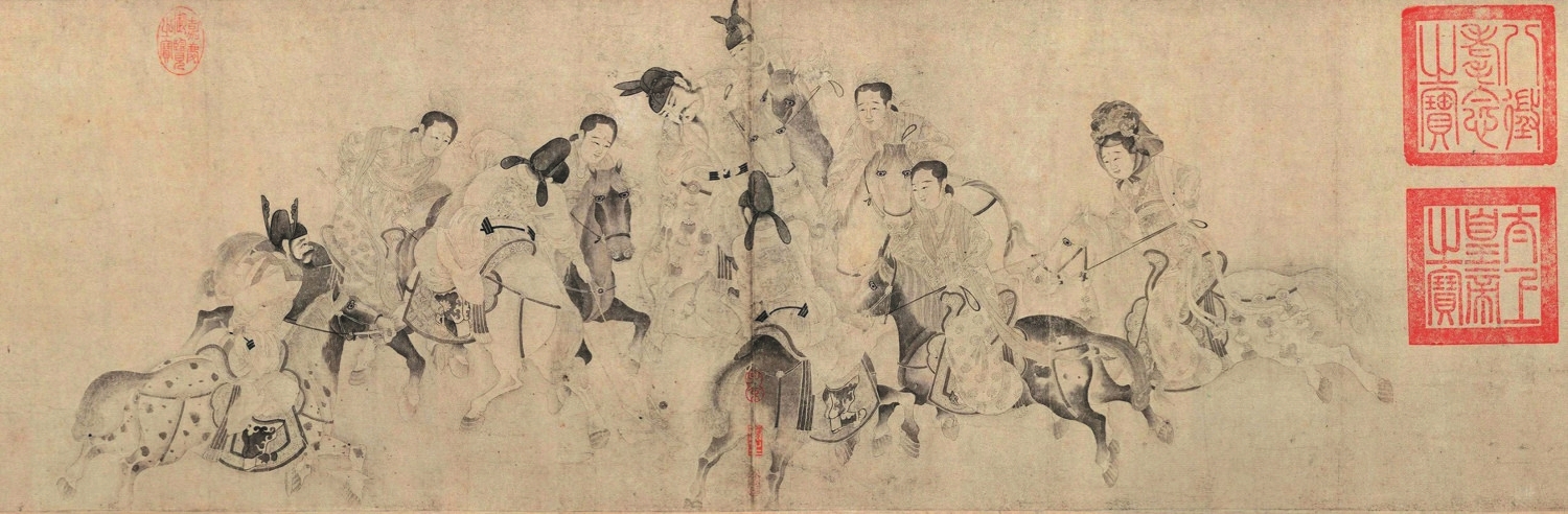 唐代女子也熱愛打馬球,《明皇擊球圖》展現(xiàn)了唐玄宗與后宮妃嬪打馬球的場景,河南洛陽唐代王雄誕夫人魏氏墓曾出土四件三彩打馬球女俑。唐代詩文中也有女子打球的記載,王建《送裴相公上太原》中寫“千群白刃兵迎節(jié),十對紅妝妓打球”,張籍的《寒食內(nèi)宴二首》亦云“廊下御廚分冷食,殿前香騎逐飛球”的詩句。由于馬球運動的流行,唐代有很多與馬球相關的文物,流傳至今的馬球、球桿、球場碑石、繪畫、泥塑等數(shù)不勝數(shù)。