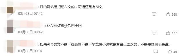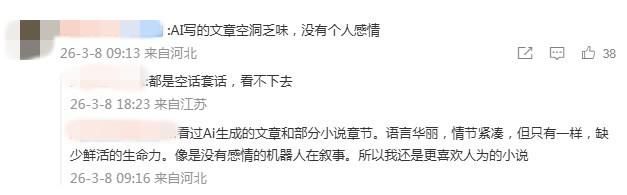 圖片來源:網(wǎng)友評論截圖 董江波對此深有感觸。他自述,自己不是全職網(wǎng)絡作家,目前也在某網(wǎng)絡文學平臺擔任負責人,“有段時間,我用于接收投稿的郵箱里涌入不少AI痕跡明顯的小說,在十篇投稿里能占一半?!?/p> 這類文章很好分辨。他總結道,有的學術味極濃,生僻詞較多,或者是模仿痕跡嚴重,“有些模仿古龍小說的經(jīng)典開頭,但又達不到人家的意境。質(zhì)量跟不上,最后肯定是拒收?!?/p> 誰能更勝一籌? 盡管時下AI非?;馃幔珜Χ▉碚f,這并沒有對他的寫作造成太大影響。 “我會嘗試利用AI來潤色短篇小說中的個別段落,或者進行校對,但不會直接用它來寫作,相對于真正有腦洞的真人作家來說,AI寫出的作品還是差了不少?!彼硎?。 在人工智能技術興起后,不少人或許都在思考一個問題,AI寫出的小說或者說作品,將來會不會超過真人寫作者的創(chuàng)作成果? 董江波認為,目前來說,由于AI參考了大量的資料,寫一寫程式化的應用文尚可,但直接從事小說尤其是長篇小說創(chuàng)作的話,恐怕還是“力不從心”,原因就在于缺乏獨創(chuàng)性。 早前,作家莫言也曾聊過有關AI與寫作的話題。在他看來,作家的思維就像天上的云朵,瞬息萬變且難以琢磨。這恰恰是人工智能難以超越的地方。 南京大學文學院教授苗懷明曾測試過AI的寫作能力,他發(fā)現(xiàn),AI的創(chuàng)作速度極快,但很多句子都是“套話”,面面俱到卻缺乏個性與深度。眼下,AI并不能替代富有創(chuàng)造力的寫作者。 董江波也認同這個觀點,“至少在目前,那些優(yōu)秀的作家、作品不會被AI取代。”但他強調(diào),部分網(wǎng)絡小說質(zhì)量欠佳,假如未來AI繼續(xù)“進化”,那這些作品被淘汰也是正常的。 寫作,會被重新定義? 如果說,腦洞大、創(chuàng)造力強的作品更能贏得讀者青睞,那么,在人工智能時代,寫作者應該如何鍛煉、保持這種能力?