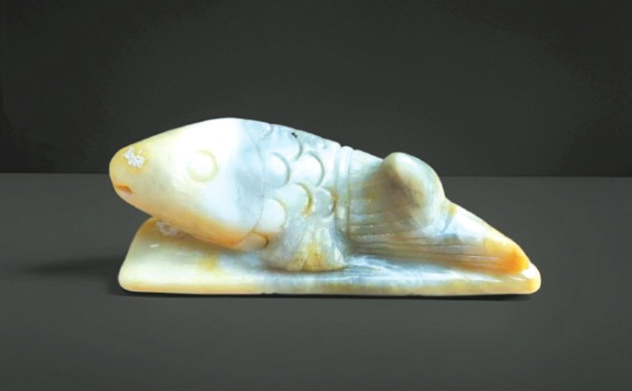 筆者藏有一件“魚(yú)躍竹排”白玉筆架,長(zhǎng)10厘米,寬2.5厘米,高3.6厘米。筆架雕一碩大魚(yú)兒躍于竹排之上,以雙鰭為支撐,魚(yú)尾舒展,一側(cè)貼于排面,另一側(cè)微微傾斜向上、向左卷曲,恰好承筆;魚(yú)頭昂揚(yáng),宛如一幅魚(yú)乘竹排、暢游河中的立體畫(huà)卷。