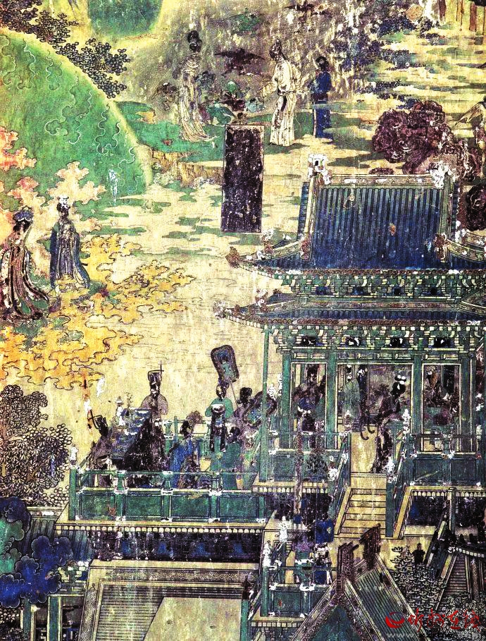 畫(huà)面中,有頭戴冠冕、身著長(zhǎng)袍的王子,焚香祈禱的王后;有嬉戲玩耍的兒童,酒樓市井里的說(shuō)唱賣藝者;還有撐傘的、捧鳥(niǎo)籠的凡夫俗子,儼然一幅幅生動(dòng)的古代宮廷生活圖、古代市井圖。豪華宮殿、樓閣、古塔、作坊、民居各類建筑應(yīng)有盡有,無(wú)不體現(xiàn)出畫(huà)師高超的技藝。