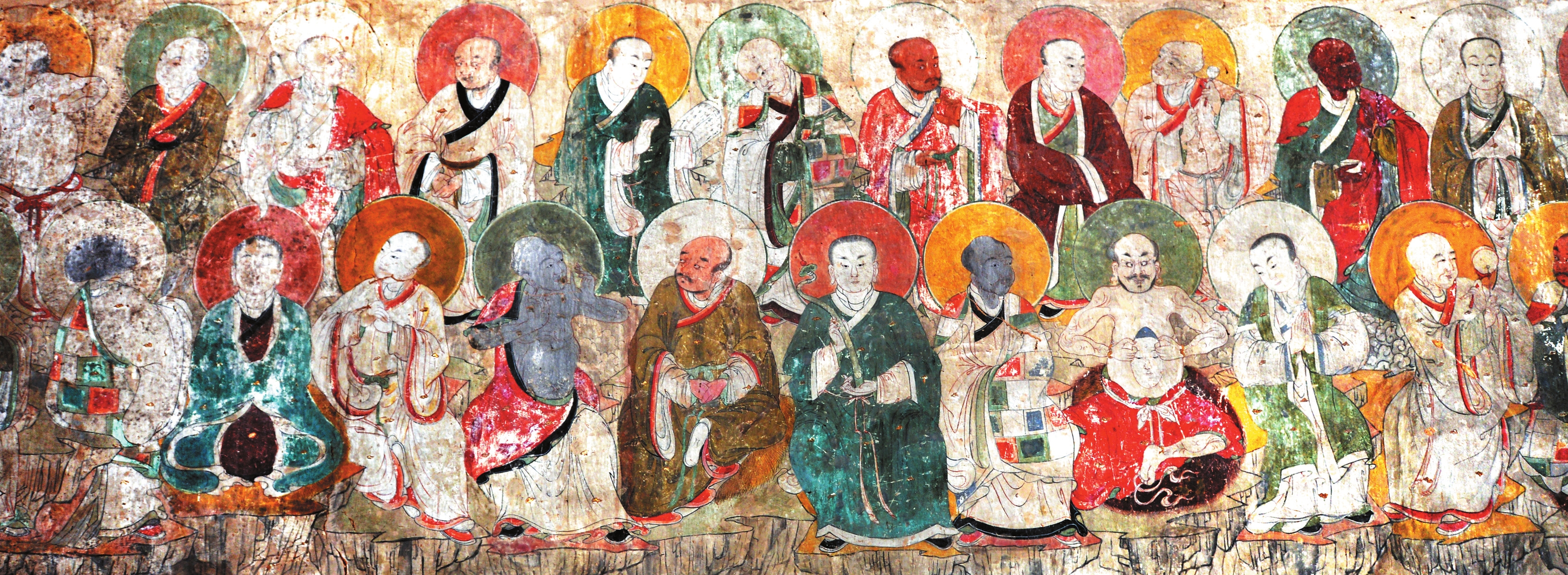 明代彩塑:文殊殿內(nèi)的佛壇上有七尊塑像,中為騎青獅的文殊,兩旁為脅侍菩薩,這些塑像在明代弘治年間重新裝繪過。此外,文殊殿內(nèi)東西墻和北墻上原有500羅漢的彩繪,現(xiàn)僅存245尊,羅漢姿態(tài)多樣,無一雷同,整幅壁畫顏色較為豐富。
