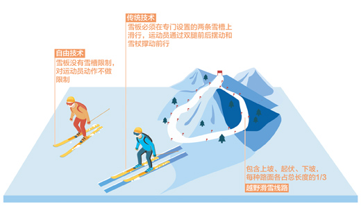 越野滑雪技術(shù)分為傳統(tǒng)技術(shù)和自由技術(shù)。傳統(tǒng)式滑行是在專門設(shè)置的兩條雪槽上進行,運動員通過雙腿前后擺動和雪杖撐動前行。自由式滑行則沒有雪槽和動作的限制。