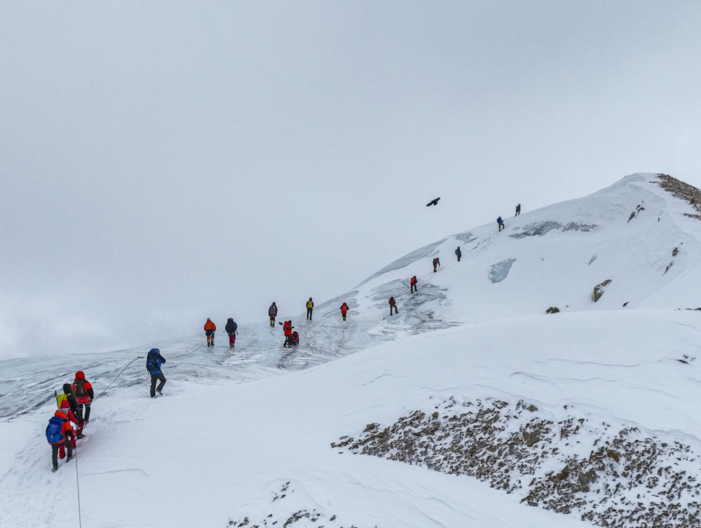 5月3日,登山愛好者正在向海拔6010米的洛堆峰峰頂進(jìn)發(fā)(無人機(jī)照片)。新華社記者孫非攝