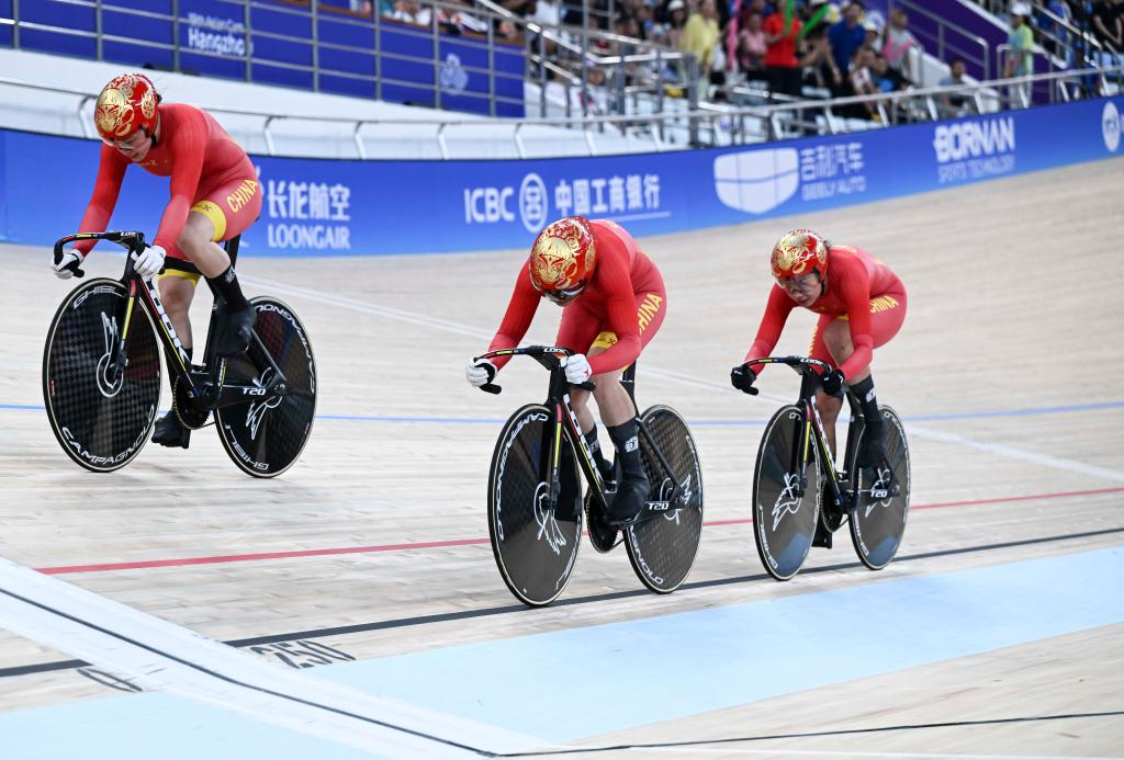 26日傍晚舉行的女子團(tuán)體競(jìng)速賽決賽中,一道紅色閃電劃破位于千島湖畔的自行車館,激起場(chǎng)內(nèi)一陣陣助威聲。鮑珊菊和隊(duì)友從一開始就占據(jù)領(lǐng)先位置,并最終以46秒376創(chuàng)造新的亞運(yùn)會(huì)紀(jì)錄,將金牌收入囊中。