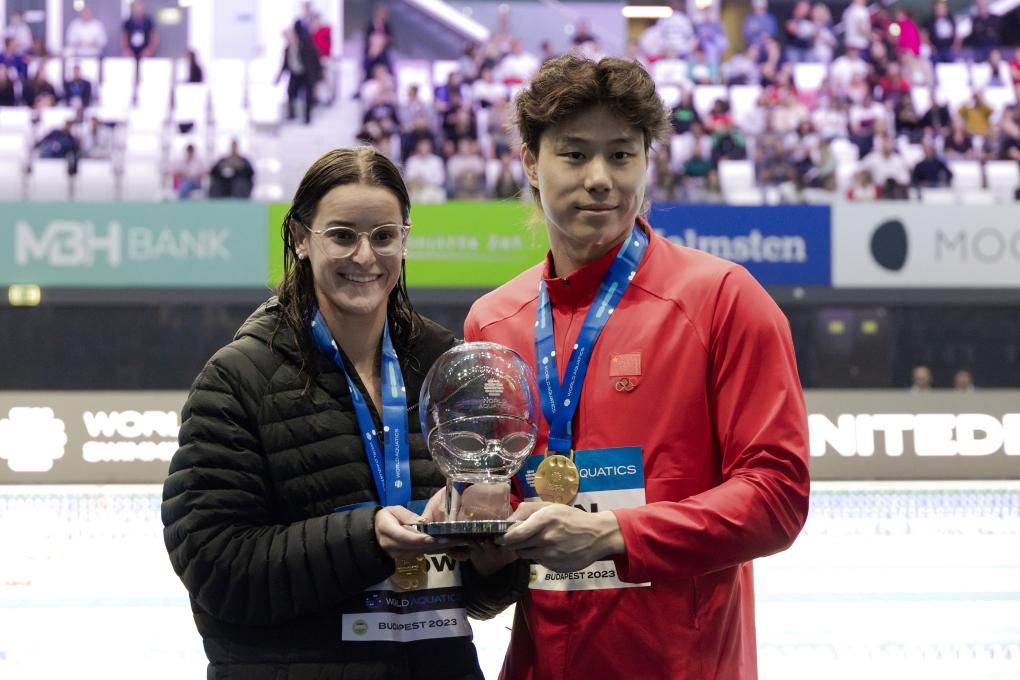 10月22日,覃海洋(右)和麥基翁獲得世界泳聯(lián)世界杯年度總冠軍。當日,2023年世界泳聯(lián)游泳世界杯布達佩斯站落幕。新華社發(fā)(弗爾季·奧蒂洛攝)