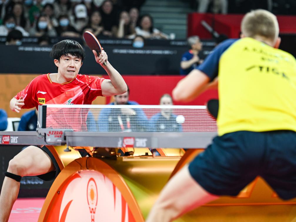 12月4日,中國隊選手王楚欽在男單比賽中回球。新華社記者 王曦 攝