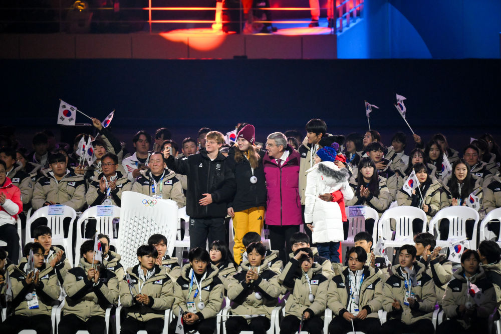 1月19日,國際奧委會主席巴赫在江陵速滑館開幕式現(xiàn)場與運動員合影。當日,第四屆冬季青年奧林匹克運動會開幕式在韓國江原道江陵速滑館和平昌圓頂體育館同時舉行。新華社記者 朱煒 攝