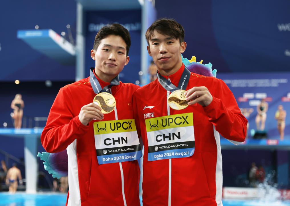 男雙3米板決賽中,王宗源/龍道一以442.41分的成績(jī)奪冠。這是王宗源繼2022布達(dá)佩斯、2023福岡后,第三次奪得世錦賽該項(xiàng)目冠軍。意大利組合馬爾薩利亞/托奇、西班牙組合阿瓦迪亞/博伊西爾分獲亞軍和季軍。