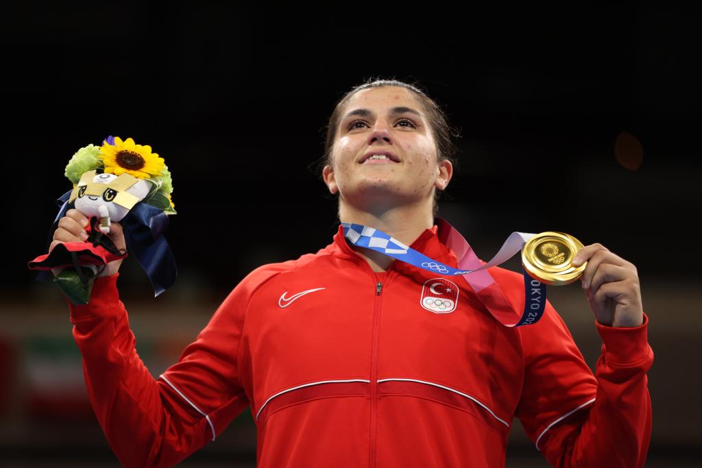 2021年8月7日,獲得冠軍的土耳其選手蘇梅內(nèi)利在領(lǐng)獎臺上。當(dāng)日,東京奧運會拳擊女子69公斤級頒獎儀式舉行。新華社記者 歐東衢 攝
