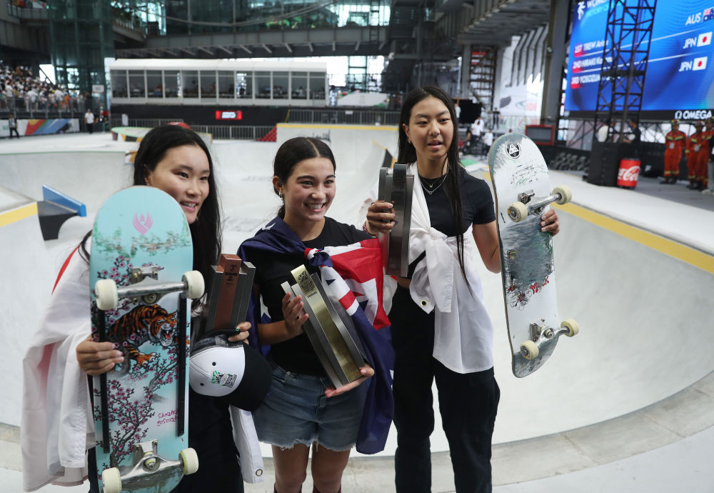 5月19日,冠軍澳大利亞選手阿麗莎·特魯(中)、亞軍日本選手開心那(右)與季軍日本選手四十住櫻在頒獎儀式后合影。當(dāng)日,在巴黎奧運會資格系列賽上海站滑板女子碗池決賽中,澳大利亞選手阿麗莎·特魯奪得冠軍,日本選手開心那與四十住櫻分獲二、三名。新華社記者 賈浩成 攝