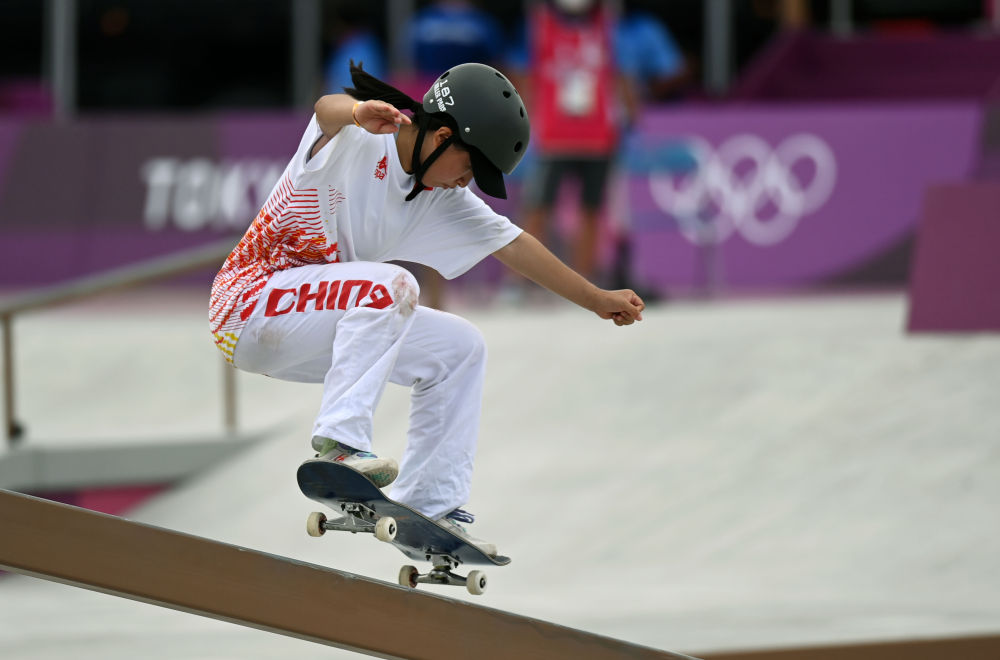 2021年7月26日,中國選手曾文蕙在比賽中。當(dāng)日,在東京奧運會女子滑板街式賽中,中國選手曾文蕙闖入決賽,并最終獲得第六名。新華社記者 李尕 攝