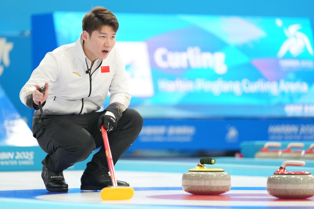 2月6日,中國隊選手王智宇在比賽中指揮隊友擦冰。當(dāng)日,在哈爾濱舉行的第九屆亞冬會冰壺混雙循環(huán)賽B組第6輪比賽中,中國隊6比4戰(zhàn)勝韓國隊。新華社記者 王松 攝