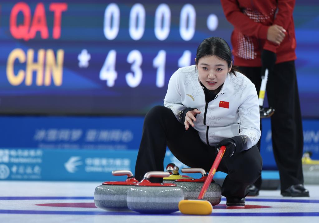 2月6日,中國隊選手韓雨在比賽中。當(dāng)日,在哈爾濱舉行的第九屆亞冬會冰壺混雙循環(huán)賽B組第8輪比賽中,中國隊10比1戰(zhàn)勝卡塔爾隊。新華社記者 王楷焱 攝