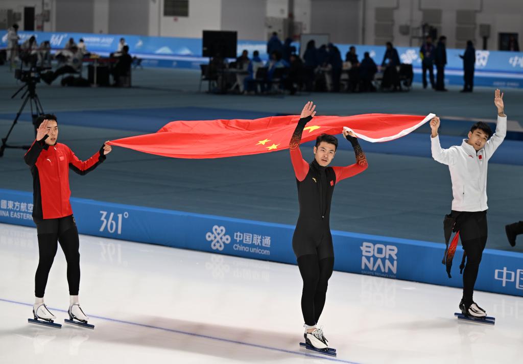 黑龍江省冰上訓(xùn)練中心速滑館里,《義勇軍進(jìn)行曲》三度奏響。當(dāng)日速度滑冰全部3枚金牌均被中國隊(duì)收入囊中。高亭宇先以0.02秒的微弱優(yōu)勢力壓日本選手森重航,奪得男子500米冠軍;又與隊(duì)友廉子文、寧忠?guī)r合作,奪得男子短距離團(tuán)體追逐金牌。女隊(duì)則又一次讓三面五星紅旗同時(shí)升起,楊濱瑜、韓梅、太智恩分獲女子3000米前三名。本屆亞冬會有三金入賬的高亭宇坦言不知道這會不會是自己最后一屆亞冬會,“(這次)我的關(guān)鍵詞是努力,相信大家一起努力,中國速度滑冰會越來越好”。