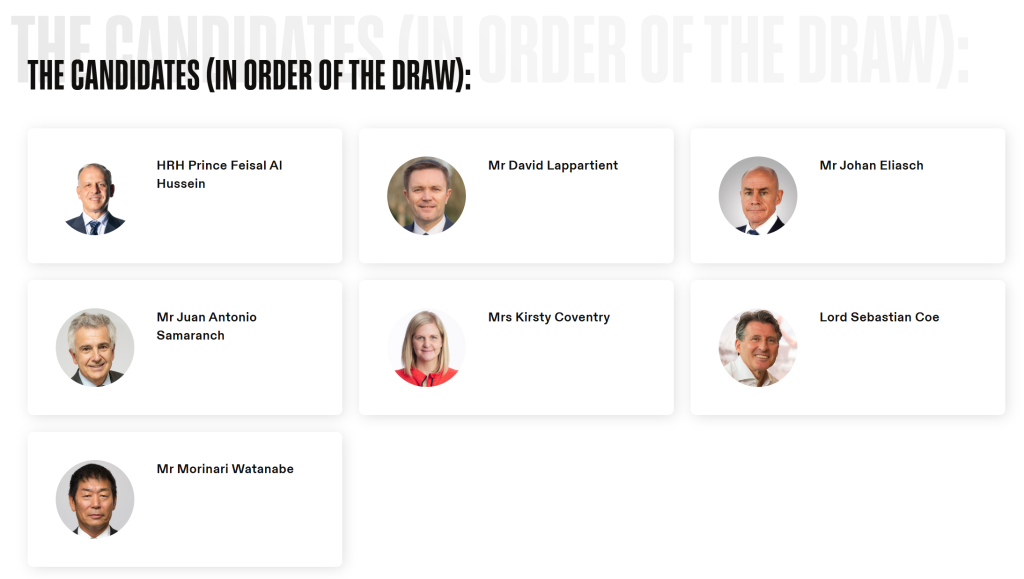 在國際奧委會近131年的歷史上,一共產(chǎn)生過九位主席,其中八人來自歐洲,另外一位來自美國。根據(jù)《奧林匹克憲章》,主席候選人必須是現(xiàn)任國際奧委會委員。本次參與競選的共有七人,其中歐洲四人,分別是國際奧委會副主席小薩馬蘭奇(65歲,西班牙)、世界田聯(lián)主席塞巴斯蒂安·科(68歲,英國)、國際自行車聯(lián)盟主席大衛(wèi)·拉帕爾蒂安(51歲,法國)和國際雪聯(lián)主席約翰·埃利亞施(63歲,瑞典和英國雙重國籍);亞洲兩人,分別是國際奧委會執(zhí)委費(fèi)薩爾·侯賽因(61歲,約旦)和國際體操聯(lián)合會主席渡邊守成(66歲,日本);非洲一人,國際奧委會執(zhí)委、運(yùn)動員委員會前主席柯絲蒂·考文垂(41歲,津巴布韋)。