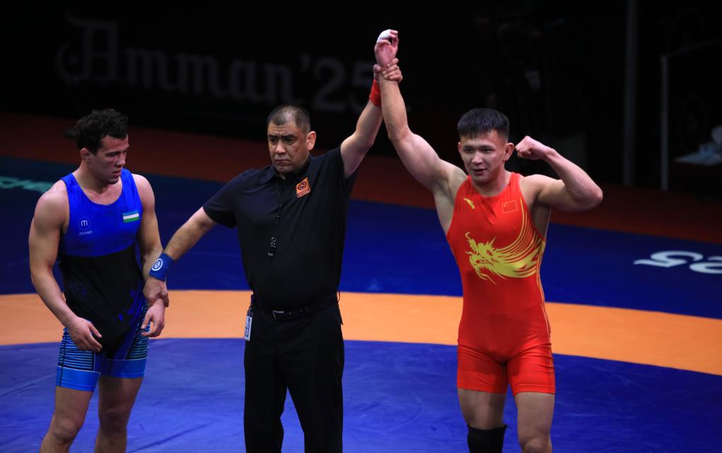 中國隊選手鄒萬豪在當(dāng)日舉行的男子自由式摔跤61公斤級銅牌賽中,以4:2戰(zhàn)勝吉爾吉斯斯坦選手梅爾扎納扎爾·吾魯。來自新疆的阿黑由·吐爾遜在74公斤級銅牌賽中,以4:0戰(zhàn)勝烏茲別克斯坦選手納斯?fàn)柼峒局Z夫,為中國隊再添一枚銅牌。